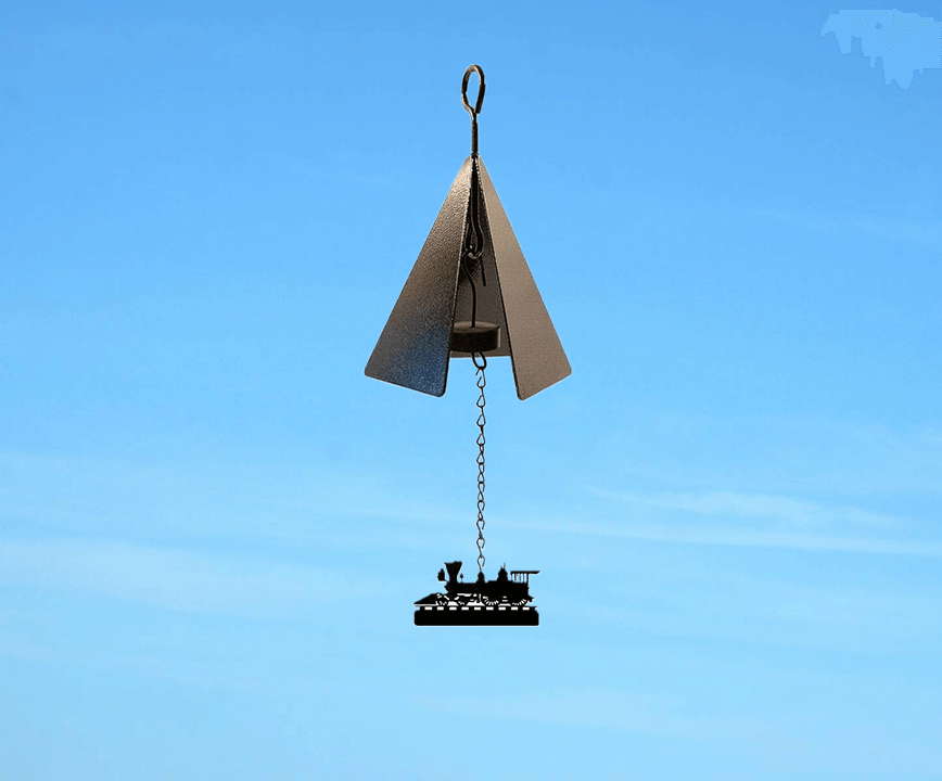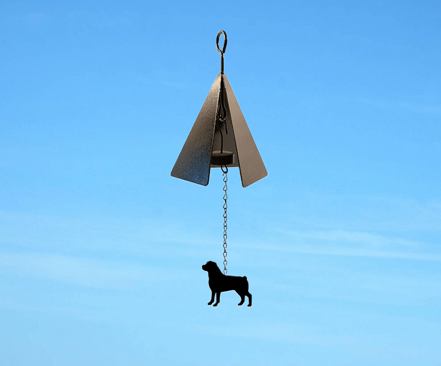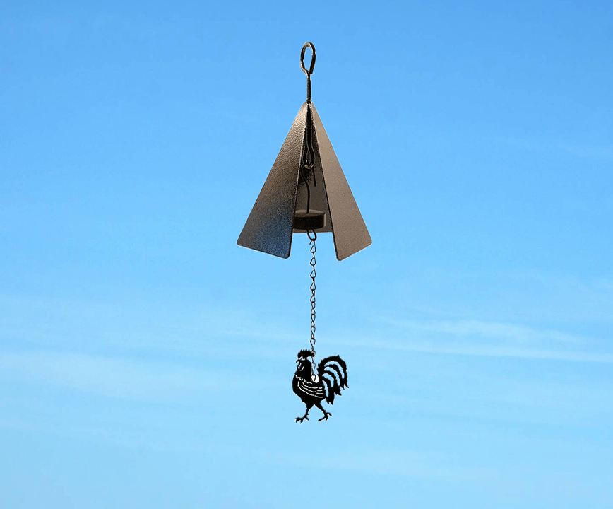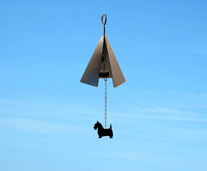 3 sided 12″ metal black bell with a 4” silhouette of choice suspended on a 6″ chain. Over All Length = roughly 24″