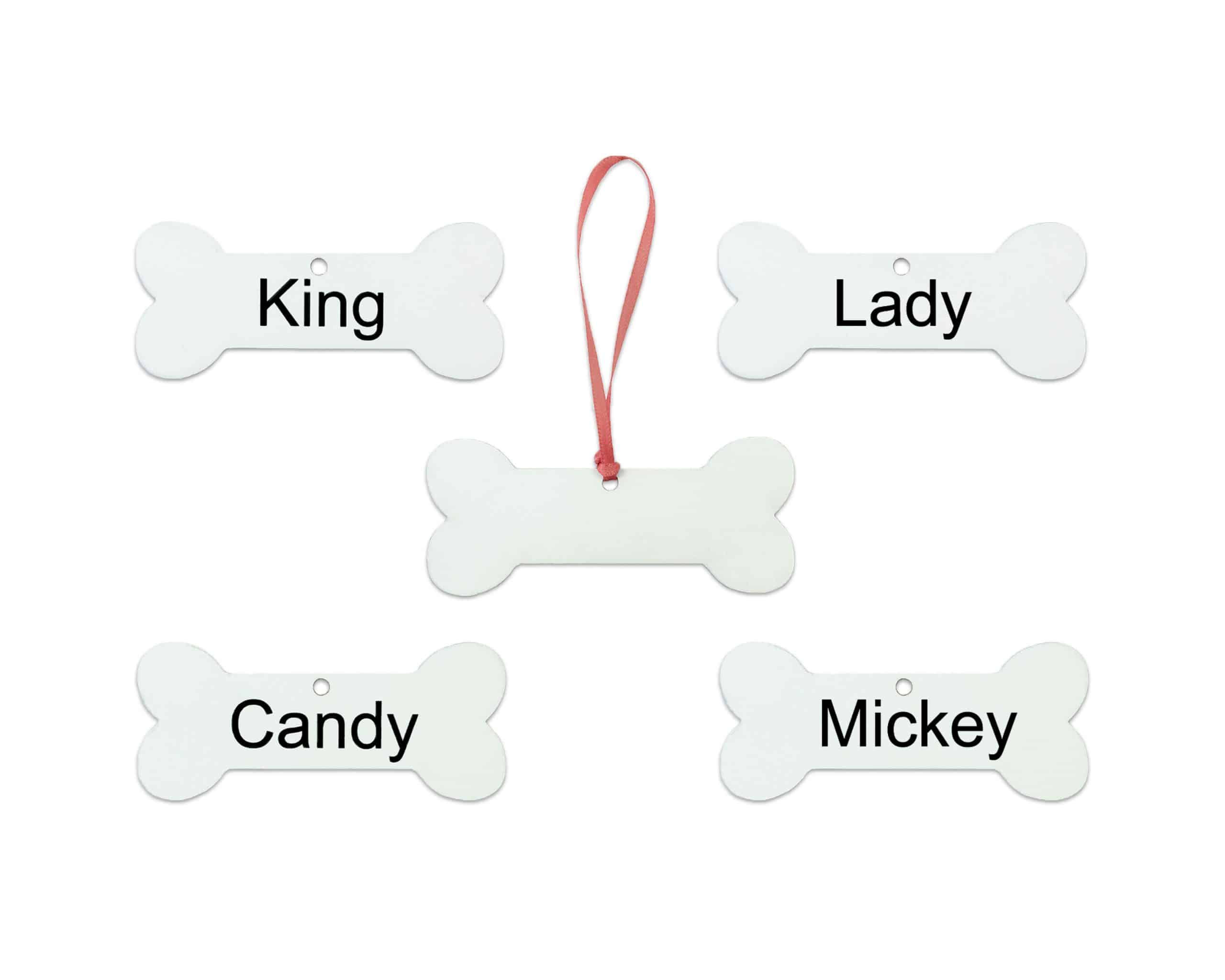 Bones Ornaments are made out of 1/16″ engravable plastic , 4″ long, each ornament comes with a quality red ribbon. Text will be in upper & lower case.