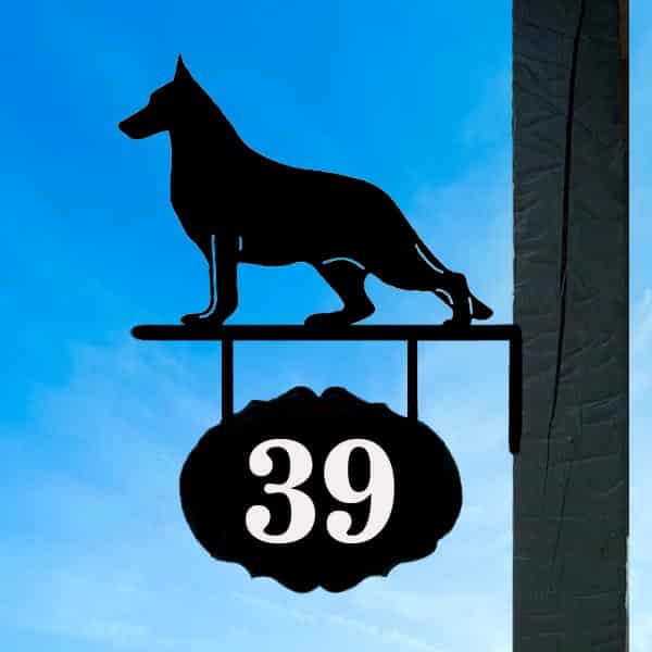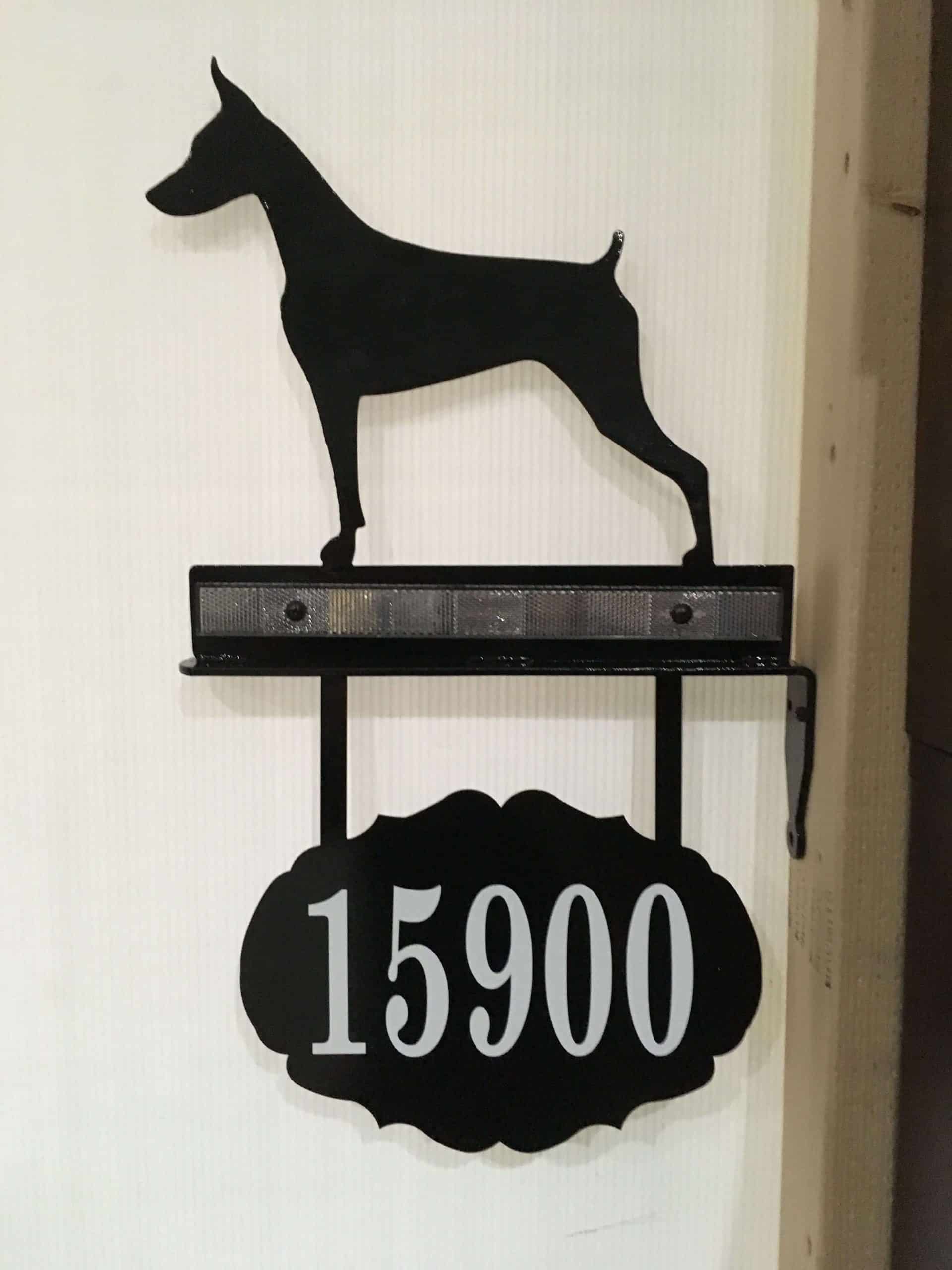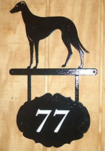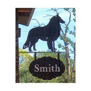 Hanging Information Signs consist of an 11.5″ silhouette, welded to a wall mount bracket with a hanging oval plate. Custom printing on both sides of the oval plate, House Number, Estate Name, Family Name…. The artwork has a baked on black textured powder coated rust resistant finish. Text will be printed in white vinyl.